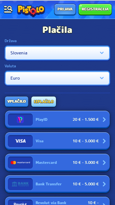 Pistolo podpira širok nabor metod za slovenske igralce – od kartic in e-denarnic do kriptovalut. Spodaj je povzetek tipičnih limitov (ti se lahko občasno spremenijo; končno stanje preverite v blagajni).